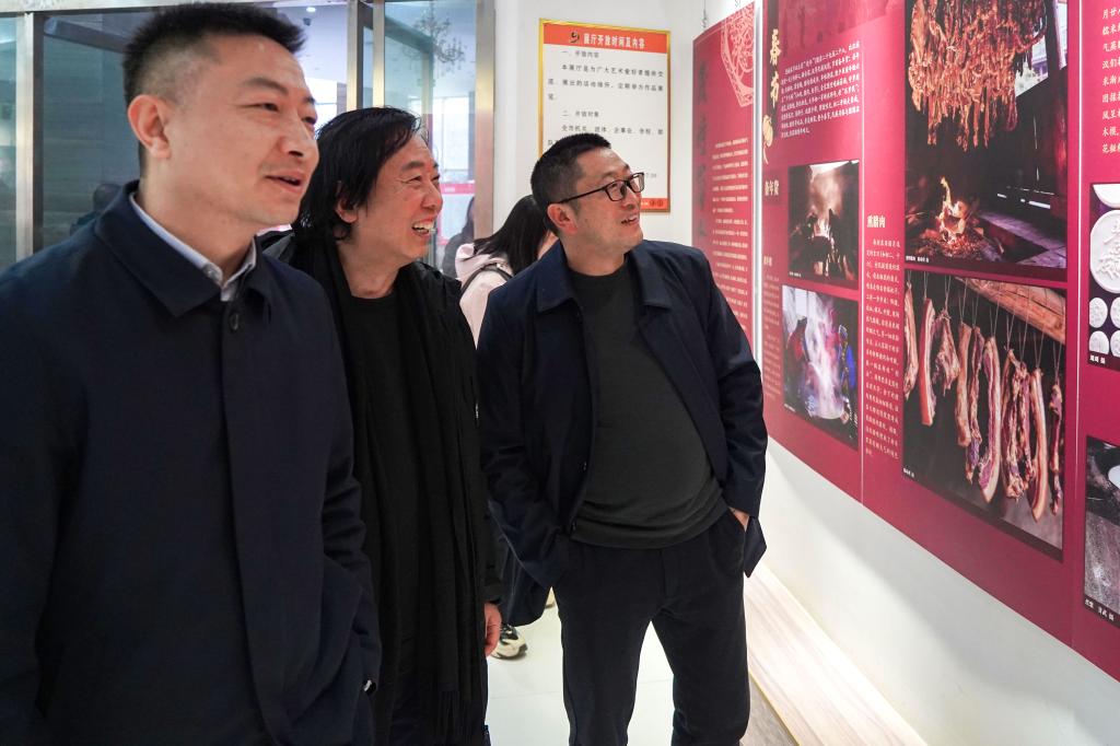 学校相关单位负责人与博瓦科技代表肖佳松(中)观看展览(利川市美术馆提供图片 )