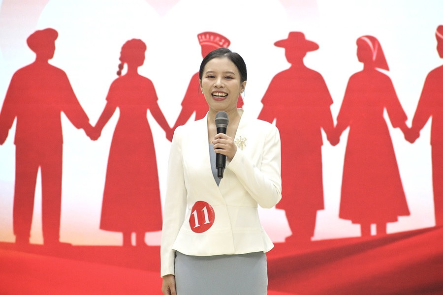 在学生组演讲比赛过程中,选手赵崇敏以《苍山莲翠峰 清江照初心:从三交到互嵌》为题,通过讲述自身经历并现场展示西兰卡普与云南扎染拼接作品,诠释民族交流交融深意。选手杨漾在《一声乡音,一句普通话,一份民族情》中,通过分享自己在恩施少数民族地区推广普通话的支教经历,阐释语言相通促进情感相连的深层内涵,折射出中华民族共同体的深层凝聚力。选手郭月宁以《山的回响,心的共同体》为题,以英语教学为媒介,在课堂中融入文化自信教育,引导学生树立立足本土、面向世界的文化观念。选手李拉昂措以《三代人的路,一条共同的根》为题展开阐述,通过介绍家族三代人的生活变迁,反映中华民族共同体意识在个体命运中的深刻体现。她字正腔圆的发音、鞭辟入里的情感剖析以及自信大方的表达方式赢得评委与观众的一致认可,获得学生组比赛第一名。