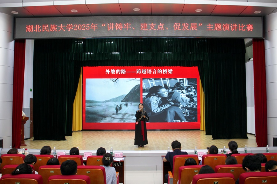 在教师组演讲比赛过程中,各位教师紧紧围绕主题,用真挚的情感和生动的语言,为观众带来一场场发人深省且极具感染力的演讲。努尔别克·艾孜玛洪结合自己独特的成长经历,在《我成长的路就是各民族交流交往交融的路》中分享各民族在生活、学习、工作中的交流与合作对个人成长和社会进步的积极影响,让听众深刻体会到民族团结的重要性。唐自君以《馕香茶暖同心圆:从天山到武陵的共同体答卷》为题,将新疆的馕与湖北武陵地区的茶文化相融合,展现不同地区各民族在文化交流、经济合作中共同绘就中华民族共同体美好画卷的生动实践。 杨旖旎以《石榴抱籽映团结 星火聚光耀山河》为题展开演讲,巧妙用“石榴籽紧密相拥”作喻,生动诠释各民族唇齿相依的深厚情谊;又以“点点星火汇聚”为引,深刻点明民族团结能凝聚成推动国家发展、照亮山河大地的磅礴力量。她富有感染力的演讲、深刻的主题阐述以及精湛的表达技巧,给评委和观众留下了极为深刻的印象,赢得现场观众阵阵热烈掌声。
