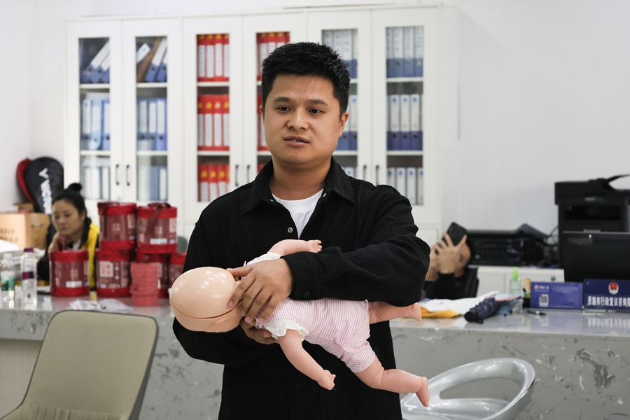 “红十字会海姆立克急救法教学”环节,桂花园社区工作人员宋城斌开展专业科普。“刚才大家画扇画得很开心,那有没有想过,要是吃零食时不小心卡住喉咙,该怎么办呀?”宋城斌以轻松提问的方式迅速将小朋友们的注意力集中到安全知识上。他通过动画短片直观展示异物卡喉的三大典型症状——无法说话、嘴唇发青、无法呼吸,以及人们本能做出的“八字护喉手势”,教小朋友快速识别紧急情况。他一边演示标准动作,一边强调关键要点,并特别提醒遇到任何异常情况要第一时间呼叫成年人帮忙,或拨打120急救电话,确保自身安全是首要原则。