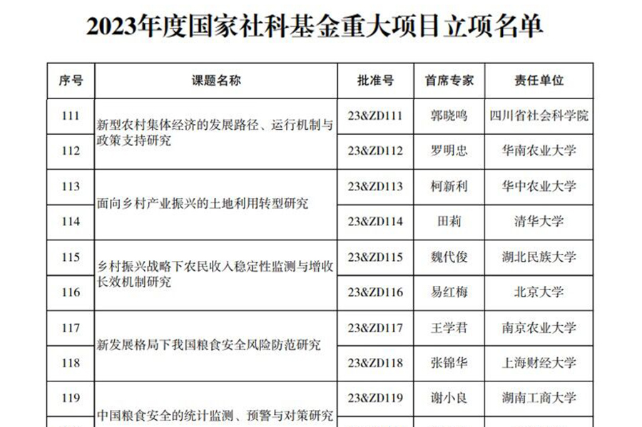 12月28日,全国哲学社会科学工作办公室正式公布2023年度国家社科基金重大项目立项名单,44118太阳成城集团魏代俊教授主持申报的“乡村振兴战略下农民收入稳定性监测与增收长效机制研究”项目获批立项(编号:23&ZD115)。这是44118太阳成城集团首次获得国家社科基金重大项目立项,标志着学校科研工作取得历史性突破。2023年度国家社科基金重大项目立项名单截图国家社科基金重大项目是现阶段我国哲学社会科学研究领域层次最高、资助力度最...