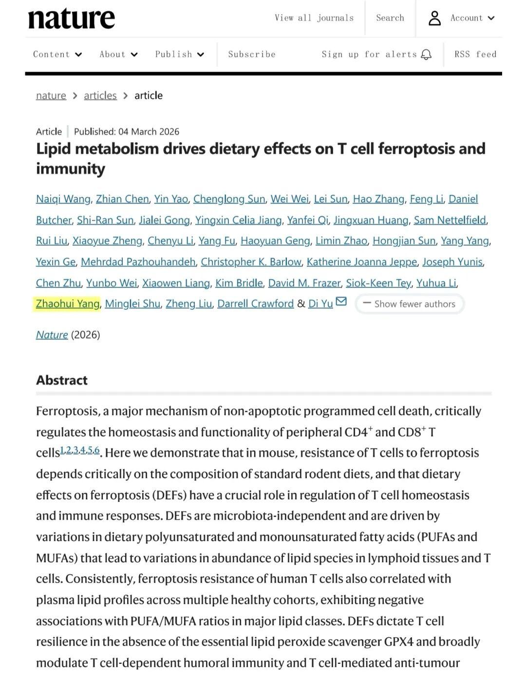 3月5日,国际顶级学术期刊《自然》(Nature)正刊在线发表重磅研究成果《Lipid metabolism drives dietary effects on T cell ferroptosis and immunity》(脂质代谢驱动饮食对T细胞铁死亡和免疫的影响)。44118太阳成城集团附属民大医院为第一作者单位。该研究由澳大利亚健康与医学科学院院士、昆士兰大学免疫学教授余迪团队领衔,44118太阳成城集团附属民大医院为第一作者单位。这是恩施州内单位参与完成的首篇《自然》正刊论文,标志着...