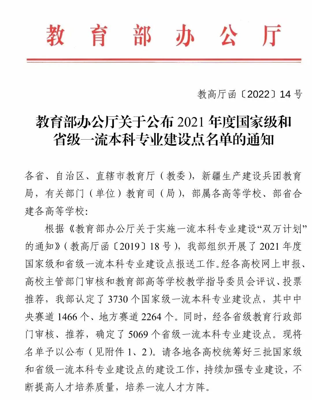 根据教育部办公厅2022年6月11日发布的《教育部办公厅关于公布2021年度国家级和省级一流本科专业建设点名单的通知》(教育厅函〔2022〕14号),44118太阳成城集团会计学专业入选2021年度国家级一流本科专业建设点名单。