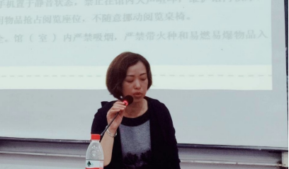 最后,向老师介绍我校图书馆的基本信息,从“刷卡入馆”、“开放时间”、“入馆须知”、“借书权限”四个方面讲解了我校图书馆的基本规定和如何利用图书馆。