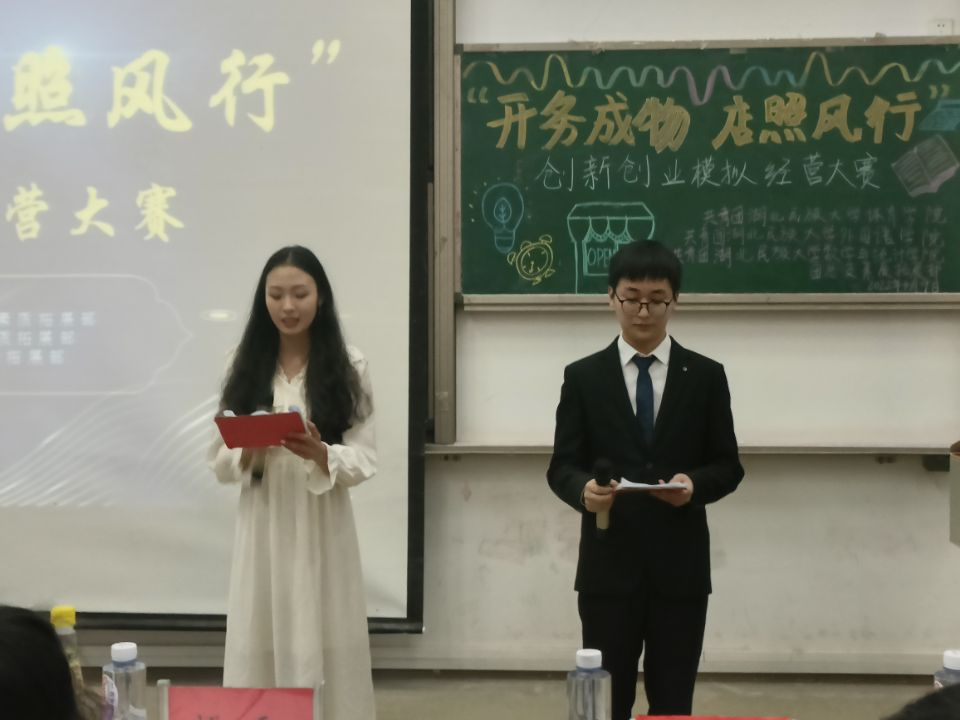 活动伊始,进入决赛的十支团队按抽签顺序依次进行PPT演讲。内容主要包括以下七点:项目背景与团队介绍;店面概述;优势分析;市场分析;营销计划;愿景规划;风险评估。十支团队从以上七点向评委老师及观众展开讲述。选手们在讲台上声音洪亮、吐词清晰、有条不紊、循序渐进,向大家展示他们项目的美好蓝图。其中,三号代表向湘粤表示想开设黄金二手书屋,此团队作出调研临毕业学生会出售大量书籍,二手书屋可以将书籍得到合力再利用,起到了节省成本保护资源的重要性。