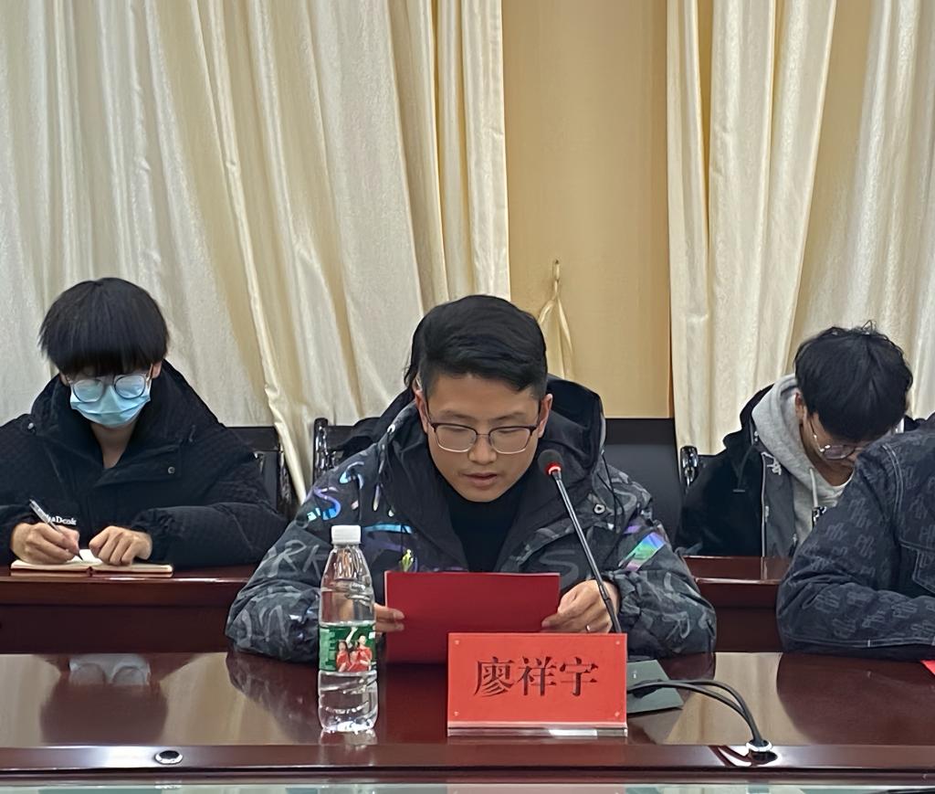新团员代表向桂林同学发言,表达对组织的感激和对未来的期许,表示要与大家共同努力,砥砺前行。优秀共青团员代表杨再双同学随后发言,他作为老团员首先对新团员加入表示热烈祝贺,并向新团员分享了自己的入团经历,号召新团员主动迎接生活中的种种挑战,不仅在学业上有所突破,更要在思想觉悟、团结协作等方面有所提升。