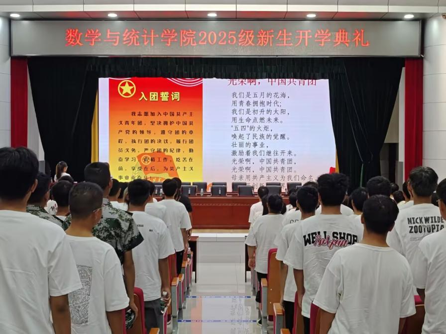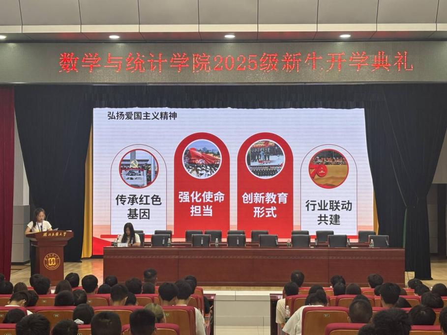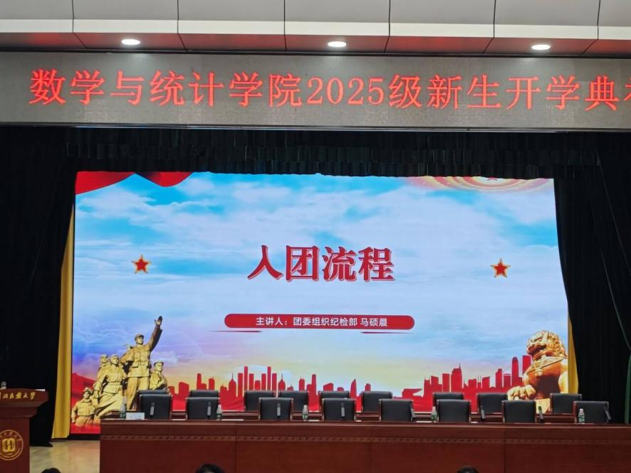 恰逢新生开学之际,为深入学习抗战精神,厚植青年学生的家国情怀,9月10日晚,数学与统计学院在行政楼1号会议室举行2025级新生开学典礼,并在典礼结束后组织开展“铭记历史,传承红色基因——九三阅兵”特色主题团日活动暨入团主题教育。活动由学院团委办公室主任余聪围主持,全体新生参加。