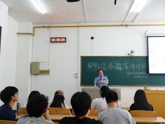 本网讯(记者 宿玉茹 熊文凯/文 宿玉茹 陆小英/图)5月23日下午,我院在修远楼5B106教室开展反电信诈骗宣讲活动,舞阳派出所张雪桢警官受邀担任此次活动主讲人,我院大一年级全体学生参加了此次活动。